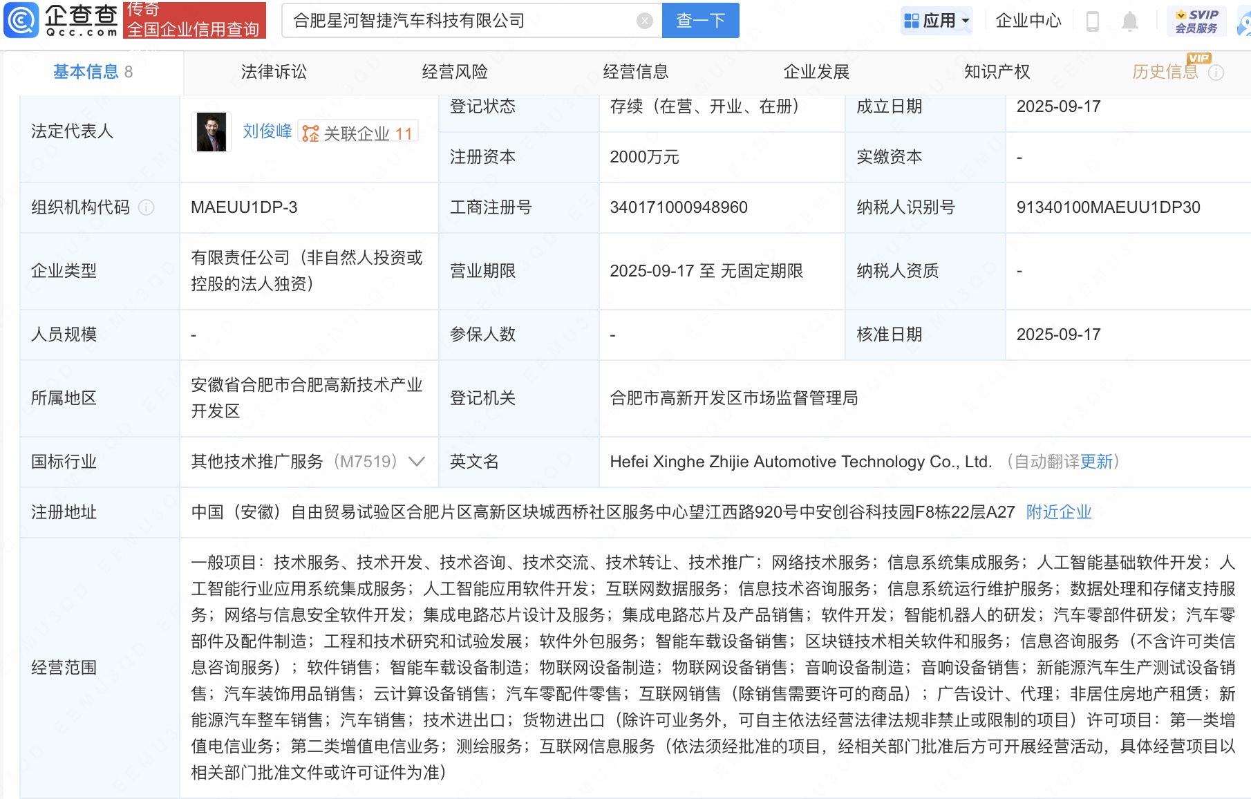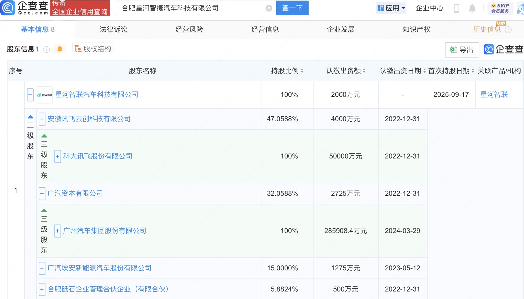 近日,合肥星河智捷汽车科技有限公司成立,法定代表人为刘俊峰粤友优配,注册资本2000万人民币,经营范围含人工智能基础软件开发、人工智能行业应用系统集成服务、人工智能应用软件开发、集成电路芯片及产品销售等。企查查股权穿透显示,该公司由星河智联汽车科技有限公司全资持股,后者由科大讯飞(002230)旗下安徽讯飞云创科技有限公司、广汽集团(601238)旗下广汽资本有限公司、广汽埃安新能源汽车股份有限公司等共同持股。